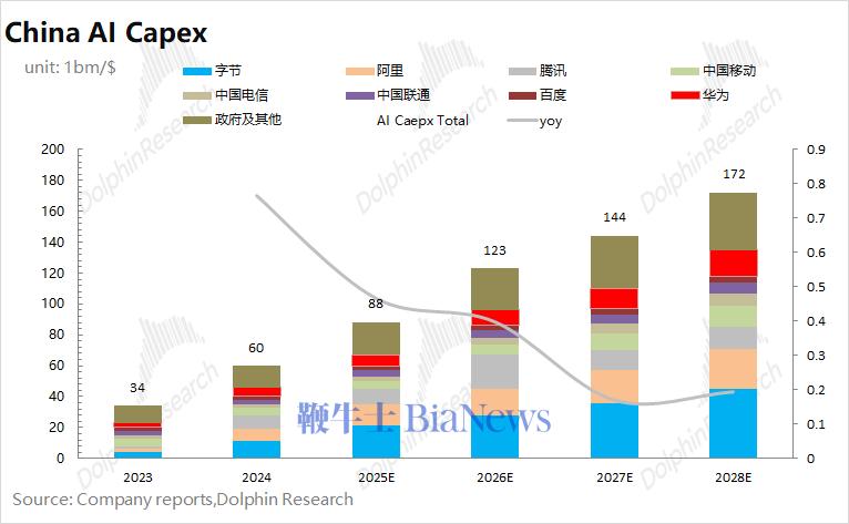 首先,海豚君将中国需要AI芯片卡的直接客户分为三类:互联网大厂(字节、腾讯、阿里、百度)、华为云、运营商及政企云(中国移动、中国联通、中国电信等)。