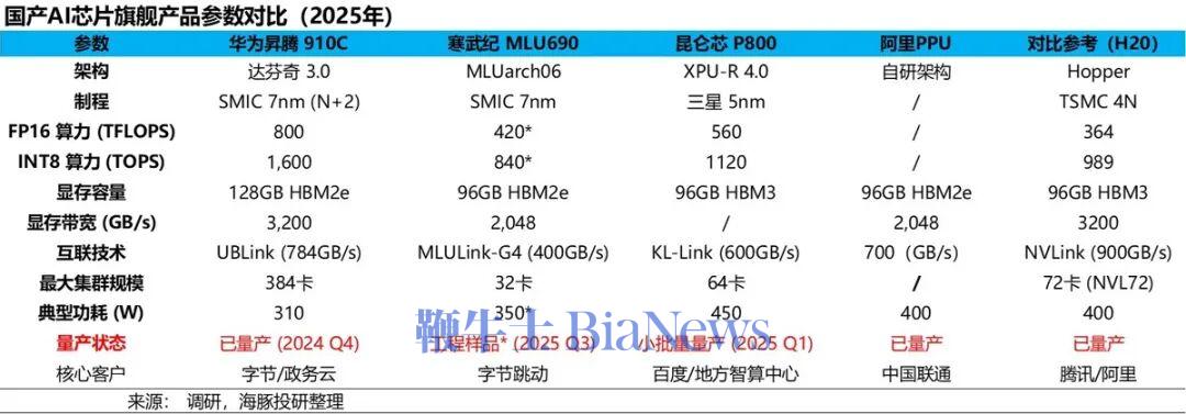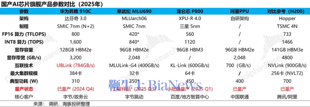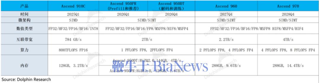 在路线图演进上能看到和H200竞争的,要等到华为下一代950芯片(适用于FP8)会是首款能用到训练上,同时内存配置、卡间互联和集群能力都比较强的国产芯片。