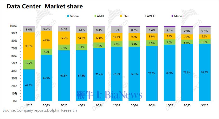 在英伟达的高额垄断溢价之下,谷歌、亚马逊等大型CSP都开启了自研芯片。尤其是在谷歌TPU的持续拉货下,博通AVGO已经成长为AI芯片市场中的“老二”(目前市占率在10%左右)。